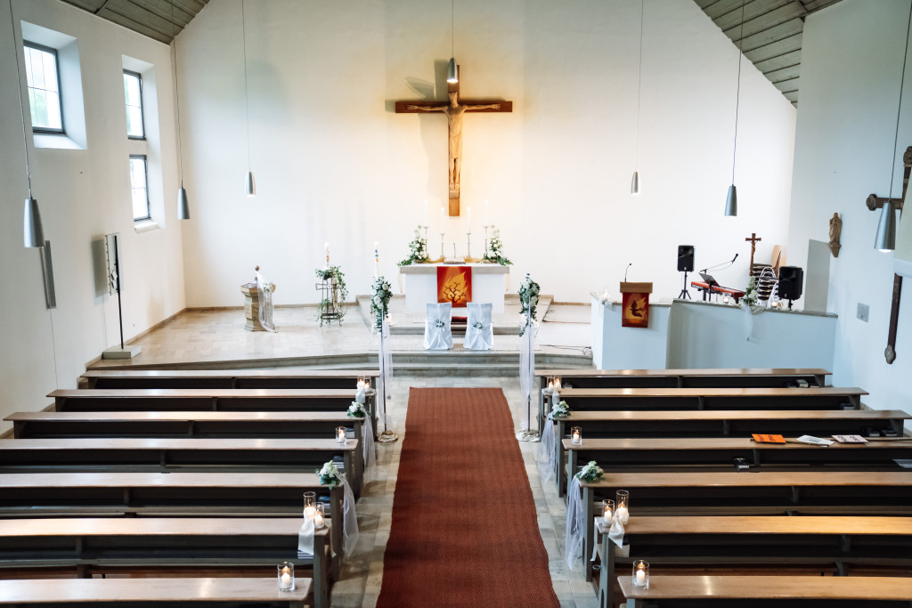 Auf dem Altar stehen vier silberne Rokokoleuchter. Die Christusfigur aus französischem Lindenholz wurde von dem Künstler Hans Ibscher 1966 geschnitzt.